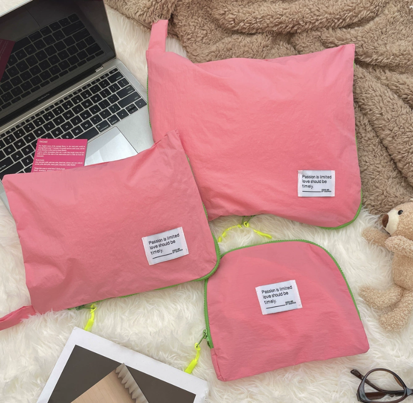 이번 시즌 굿즈의 핵심은 '가방류'입니다. 파우치·니트백·미니백 모두 단가 대비 손에 들고 다닐 수 있는 아이템이라 브랜드 노출 빈도가 높습니다. 제품을 담는 용도도 되고, 일상에서도 꺼내 쓰기 때문에 한 번 증정하면 브랜드가 오래 남습니다.